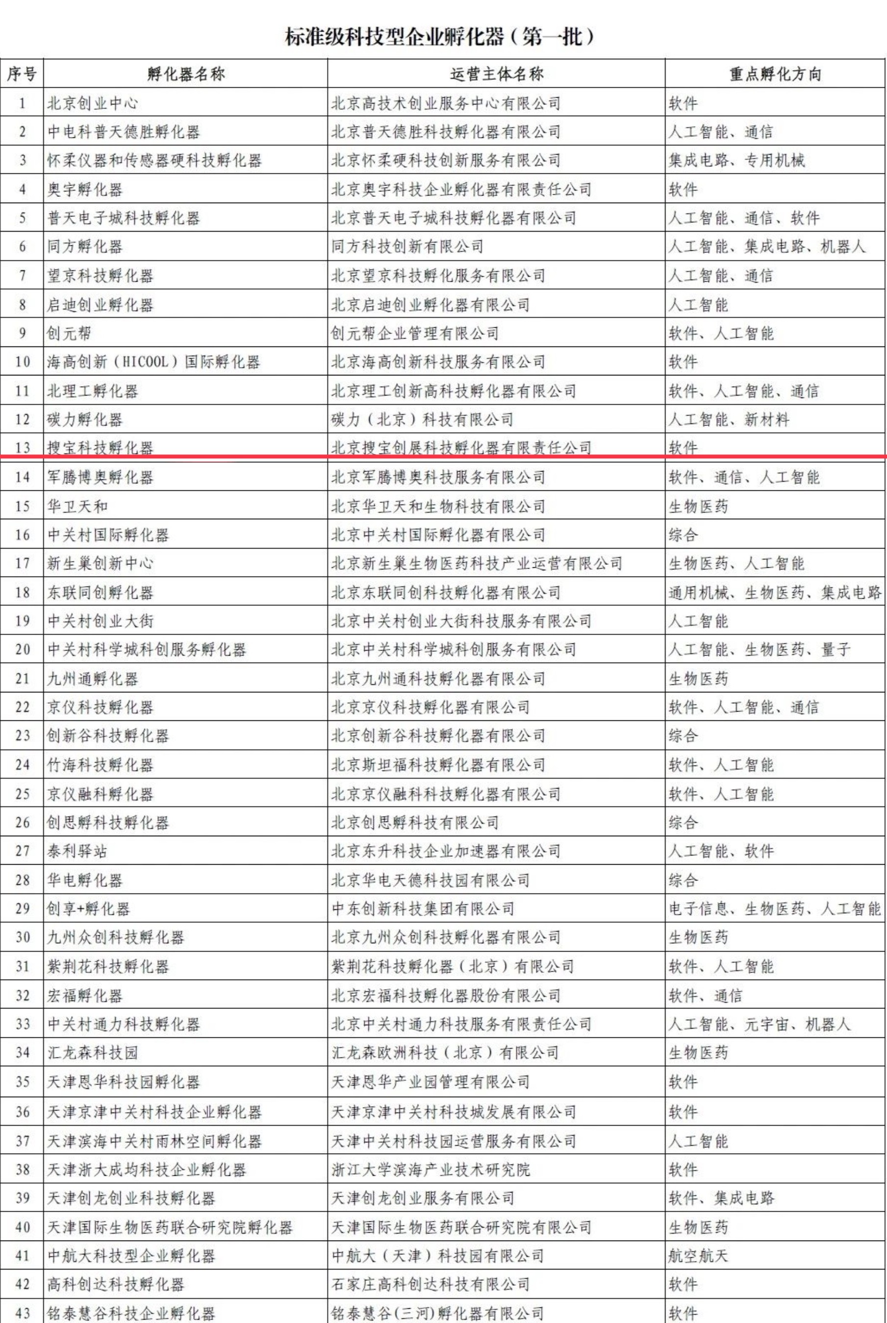近日,工业和信息化部发布首批科技型企业孵化器名单,其中标准机402家,北京34家。北京搜宝创展科技孵化器有限责任公司所属的搜宝科技孵化器入选其中。